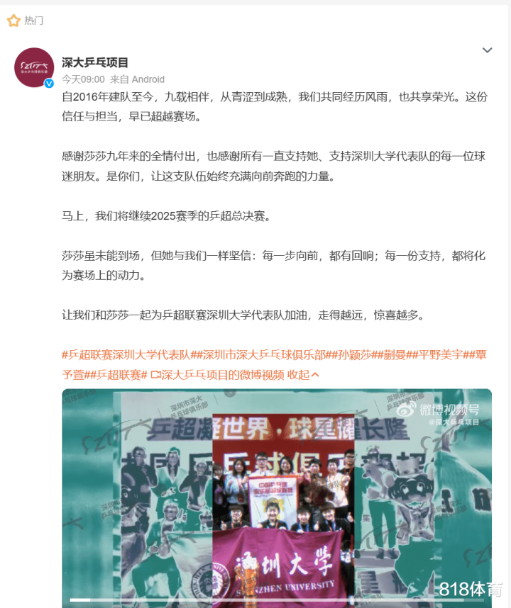 孙颖莎本人则通过视频向球迷致歉,表示自己虽虽然无法参赛,但“与深圳大学的情谊永不缺席”,并祝福队友取得佳绩。