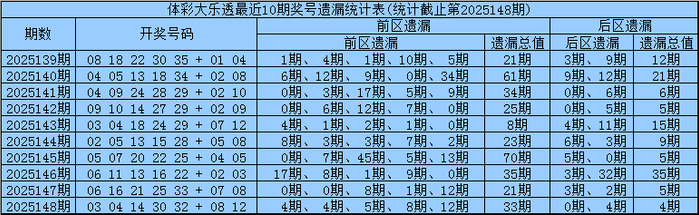 体彩大乐透第2025148期开奖回顾:前区奖号:03、04、14、30、32,后区奖号08、12,前区前各位遗漏:4期、4期、5期、8期、12期,遗漏总值33期,后区各位遗漏0期和4,遗漏总值 4期。