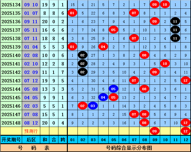 后区奖号分析:上期后区奖号为08+12,遗漏期数为0期和4期,目前后区号码01-12分别遗漏:9期、2期、2期、3期、3期、16期、1期、0期、6期、7期、10期、0期,本期后区注意号码02、06、09、11、12,两码关注09、12。