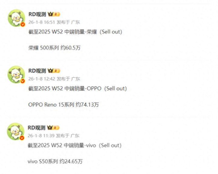 现在OPPO Reno15系列、荣耀500系列、vivo S50系列都进入了平销期,所以我们可以对比一下平销期内谁的销量更多一些。数据是来自行业人士“RD观测”,这是他在1月8日提供的。